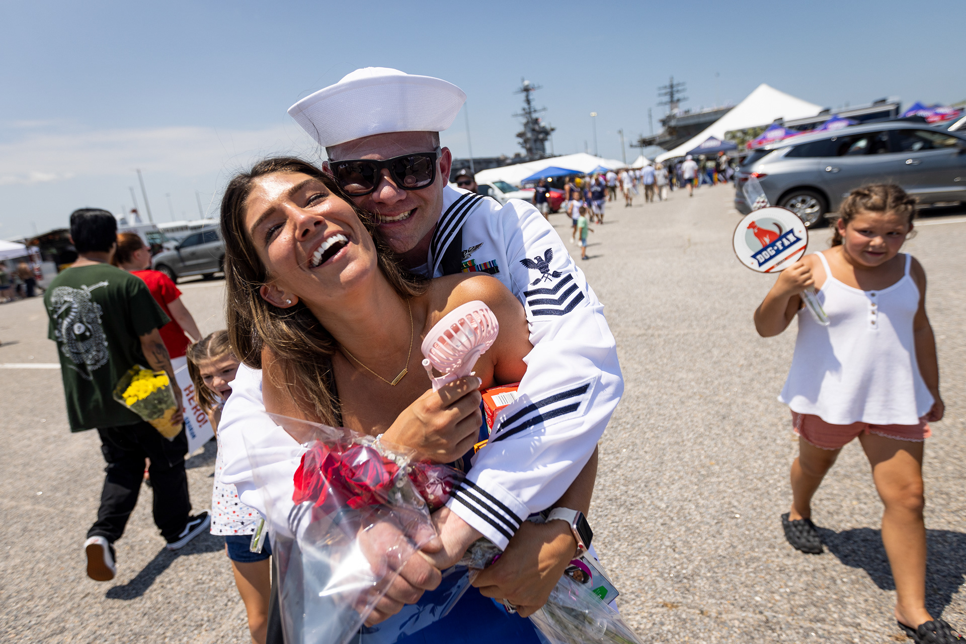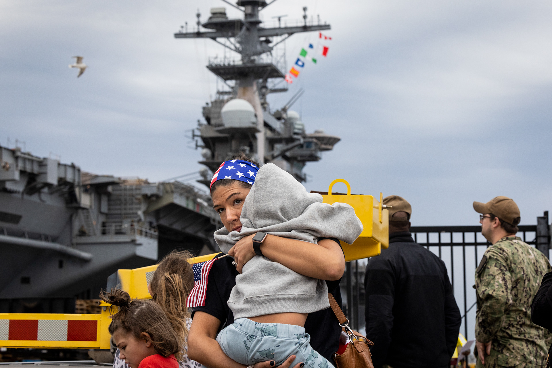 The carrier strike group accumulated more than 31,000 flight hours and completed more than 10,000 aircraft launches and recoveries and more than 13,800 sorties in a busy operational tempo during the combat deployment, the Navy reported. Overall, the strike group launched attacks against more than 460 Houthi targets. A quick visit from Secretary of the Navy Carlos Del Toro to sailors waiting in the hangar bay concluded their time on board. Before departure, Drew called his wife on the pier to organize where to meet in the chaos of thousands eagerly awaiting their loved ones. “I love you,” the husband said. “I will see you soon.”