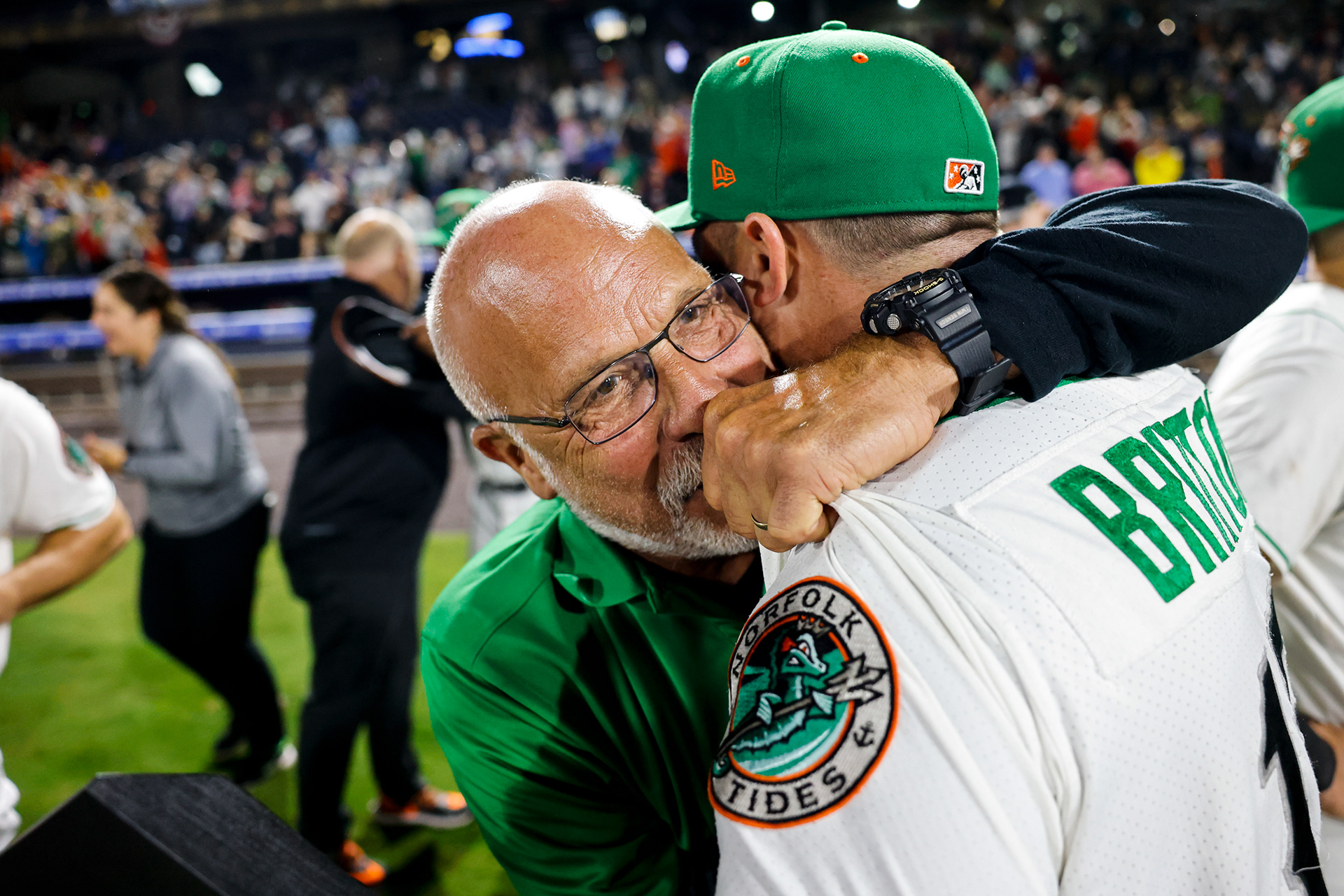 Kenny Manger hugs Norfolk manager Buck Britton after the Norfolk Tides defeated the Durham Bulls 7-0 in game three of the International League Championship series on Sept. 28, 2023, at Harbor Park in Norfolk, Virginia. The win is the first league championship win for Norfolk since 1985.